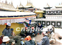 一些修復(fù)布達(dá)拉宮墻體的藏族工人在輝煌的金頂旁小憩。西藏拉薩布達(dá)拉宮金頂五月開(kāi)始進(jìn)行局部整修。中新社記者 滿會(huì)喬 攝