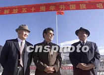 多彩西藏:布達拉宮前看升旗(圖文) 2001年5月24日 06:48 ![]() 中國西藏拉薩布達拉宮廣場二十三日舉行隆重的升旗儀式,慶祝西藏和平解放五十周年。中新社記者 滿會喬 攝 ![]() 全國人大常委會副委員長、西藏自治區(qū)政協(xié)主席帕巴拉·格列朗杰(中),自治區(qū)黨委常務副書記、自治區(qū)人大主任熱地(右)等出席了在拉薩布達拉宮廣場舉行的“升國旗·唱國歌”儀式。中新社記者 滿會喬 攝