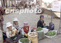 西藏拉薩街頭小販在叫賣(mài)野菜,新鮮的野菜為拉薩市民的餐桌更增色彩。中新社記者 滿會(huì)喬 攝