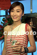 名模藝人周麗淇31日在香港出席三星流動電話專門店開幕,拍照不忘展示三星最新型號手機。中新社傳真 鄧慶樂 攝