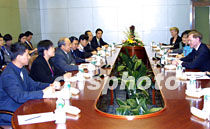 二○○一年APEC貿(mào)易部長會議將于六月六日開幕。會議主席、中國外經(jīng)貿(mào)部部長石廣生和中國代表團團長、外經(jīng)貿(mào)部首席談判代表龍永圖,五日在上海國際會議中心與經(jīng)濟體代表團團長舉行雙邊會談。圖為石廣生與美國貿(mào)易談判代表羅伯特·佐立克一行會晤。中新社記者 潘索菲 攝