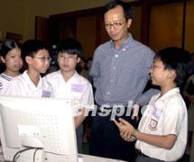 香港財政司司長梁錦松周六上午一身便裝出席香港優(yōu)秀電腦網(wǎng)頁設計比賽頒獎典禮時,欣賞由十二歲少年蔡悅剛(右一)設計的網(wǎng)頁。中新社傳真任晨鳴攝