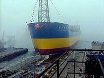 大連中國船舶重工集團公司為中國海洋石油總公司生產(chǎn)的中國最大、最先進的南海奮進號“15萬噸浮式生產(chǎn)儲油船”十八日順利下水。此船兼有生產(chǎn)和儲油的作用,將在中國南海油田工作十年以上。在船舶制造總量上,中國已連續(xù)六年居世界第三,僅次于日本、韓國。