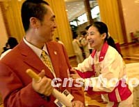 中國著名導(dǎo)演張藝謀與奧運會冠軍劉璇,在中國駐莫斯科大使館互相祝賀北京申辦奧運會成功。中新社記者 賈國榮 攝