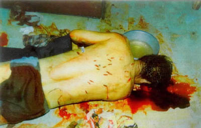 圖:練“法輪功”害人害己 2001年07月26日 20:15 ![]() 家住河北承德市桃李街的李亭受“法輪功”的欺騙,認為自己的父母是“惡魔”,他自己是“佛”。“佛”要把“惡魔”除掉,遂用尖刀將父母殺死。圖為被害者李亭之父。新華社發(fā) 馬健民,男,54歲,華北油田退休職工。其家人稱,馬已練習“法輪功”兩年左右,達到了癡迷的程度,時常出現(xiàn)精神恍惚和失常,堅持認為自己的腹部有個“法輪”。1998年9月4日馬健民在家中用剪刀剖腹尋找,因救治不及時死亡。這是馬健民自殺后的慘景。新華社發(fā) |