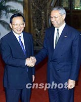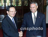 中美外長會(huì)談 鮑威爾重申堅(jiān)持一個(gè)中國政策 2001年07月28日 17:21 ![]() 中國外交部長唐家璇二十八日在北京釣魚臺國賓館會(huì)見美國國務(wù)卿鮑威爾。中新社記者 滿會(huì)喬 攝 ![]() 中國外交部長唐家璇與美國國務(wù)卿鮑威爾二十八日在北京釣魚臺國賓館舉行會(huì)談。中新社記者 毛建軍 攝