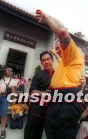 圖文:海外黃飛鴻門人到廣東佛山尋根拜祖 2001年08月28日 06:15 ![]() 南粵武林一代宗師黃飛鴻的一百多名海外弟子,27日在佛山黃飛鴻紀(jì)念館依照傳統(tǒng)武林習(xí)俗祭拜祖師黃飛鴻。他們是專程從美國、德國、瑞典等地來粵參加佛山黃飛鴻紀(jì)念館全面開業(yè)暨黃飛鴻一百四十五周年寶誕尋根拜祖等系列活動(dòng)的。中新社記者 梁永強(qiáng) 攝 ![]() 27日,來自美國的黃飛鴻傳人、著名武術(shù)家余志偉在佛山黃飛鴻紀(jì)念館前為其洋弟子舉行隆重的入室弟子授腰帶儀式,以示對(duì)祖師的崇敬。中新社記者 梁永強(qiáng) 攝