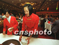圖:為西部論壇客商服務小姐行唐代禮節(jié) 2001年09月05日 18:36 ![]() 西安唐樂宮的服務員五日以唐代禮節(jié)為參加西部論壇的賓客準備茶水,會上近二百家國內外企業(yè)的代表在此進行了項目洽談。中新社記者 宋吉河 攝