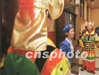 圖:“唐兵”把守西部論壇會場顯盛世威嚴(yán) 2001年09月06日 15:09 ![]() 西安兩名身扮唐代武士的門衛(wèi)在九月西部論壇分會場唐樂宮值勤,以渲染唐代氣氛顯示當(dāng)今魅力。中新社記者 宋吉河 攝 |