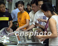 ![]() 廣州市民十分關(guān)注美國(guó)受到恐怖襲擊事件。十二日清晨,人們紛紛上街購買當(dāng)天報(bào)紙,令不少報(bào)紙脫銷,報(bào)社不得不連忙加印。某晚報(bào)還加出號(hào)外。中新社圖 梁永強(qiáng) 攝