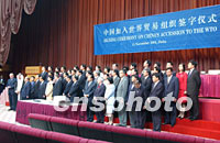 圖:中國(guó)加入WTO簽字儀式現(xiàn)場(chǎng) 2001年11月12日 02:43 ![]() 中國(guó)加入WTO簽字儀式于北京時(shí)間12日凌晨在多哈舉行,圖為簽字現(xiàn)場(chǎng)。中新社記者 錢興強(qiáng) 攝 |
