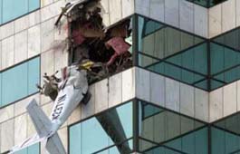 未獲批準(zhǔn)強行起飛 美15歲高中生駕機撞樓(圖) 2002年01月06日 09:17 ![]() 撞樓現(xiàn)場 中新網(wǎng)北京1月6日消息:外電報道說,一架小型飛機5日下午撞進美國佛羅里達州坦帕市一棟40層大樓后墜毀。墜毀飛機的駕駛員是一個15歲的高中生。根據(jù)當(dāng)?shù)胤梢?guī)定,他不能單獨駕駛飛機。 據(jù)美聯(lián)社報道,雖然聯(lián)邦調(diào)查局初步認(rèn)為此次飛機撞擊大樓事件與恐怖主義無關(guān),但仍派遣了調(diào)查人員前往現(xiàn)場。 美國海岸警衛(wèi)隊官員說,這架飛機是在沒有獲得有關(guān)當(dāng)局批準(zhǔn)的情況下起飛的,而且駕駛員對要求其降落的信號置之不理。海岸警衛(wèi)隊直升飛機隨即對這架單引擎飛機進行了跟蹤飛行。當(dāng)時,兩架飛機距離最近時只有幾米。海岸警衛(wèi)隊官員皮特曼毫不懷疑小型飛機上的駕駛員明白直升飛機要求其降落的信號。 目前還沒有關(guān)于人員傷亡的報道,大樓在撞擊后沒有起火。飛機的機尾還懸掛在大樓外側(cè)。 |