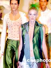 ![]() 香港時裝節(jié)展示前衛(wèi)男女冬裝。“香港時裝節(jié)2002秋冬系列”的“冬日傳奇”時裝展示1月15日在香港會展中心舉行,模特在“冰天雪地”中展示香港設(shè)計師最新設(shè)計的男女前衛(wèi)冬裝。中新社傳真 任晨鳴 攝 ![]() 香港時裝節(jié)展示黑紅相佩女冬裝!跋愀蹠r裝節(jié)2002秋冬系列”的“冬日傳奇”時裝展示1月15日在香港會展中心舉行,模特在“冰天雪地”中展示香港設(shè)計師最新設(shè)計的黑紅相佩的女冬裝。中新社傳真 任晨鳴 攝