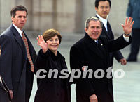 圖文:“空軍一號”平穩(wěn)降落 布什總統(tǒng)飛抵北京 2002年02月21日 10:00 ![]() 美國總統(tǒng)布什與夫人二十一日上午抵達(dá)北京首都國際機場,開始為期兩天的工作訪問。中新社圖 毛建軍 攝