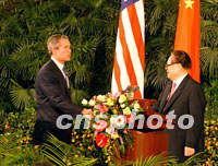 圖文:中美兩國元首會談后共同會見記者回答提問 2002年02月21日 13:15 ![]() 國家主席江澤民與美國總統(tǒng)布什二十一日在北京共同會見中外記者,這是繼APEC上海峰會以來兩國元首第二次共同會見記者。中新社記者 滿會喬 攝 ![]() 中國國家主席江澤民二十一日在北京迎接美國總統(tǒng)布什登臺,出席共同會見記者的電視直播。中新社記者 賈國榮 攝