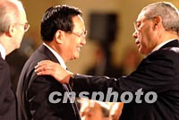 圖:唐家璇外長與鮑威爾交談 2002年02月21日 16:12 ![]() 中國外交部長唐家璇二十一日在北京與隨布什總統(tǒng)訪華的美國國務(wù)卿鮑威爾交談。中新社記者 賈國榮 攝