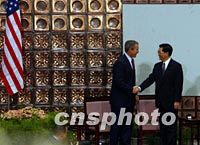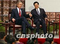 ![]() 中國國家副主席胡錦濤二十二日在北京清華大學(xué)聆聽訪華的美國總統(tǒng)布什演講。中新社記者 賈國榮 攝