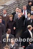 圖:布什與夫人在八達(dá)嶺長城 2002年02月22日 19:26 ![]() 美國總統(tǒng)布什與夫人勞拉二十二日下午在警衛(wèi)和陪同人員簇?fù)硐拢d致勃勃地登上北京八達(dá)嶺長城。中新社記者 毛建軍 攝