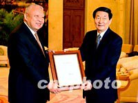 朱镕基會見董建華 中央全力支持香港恢復(fù)經(jīng)濟(jì) 2002年03月07日 15:11 ![]() 中國總理朱镕基七日上午在北京人民大會堂香港廳,向連任香港特別行政區(qū)第二任行政長官的董建華先生頒發(fā)任命書。中新社記者 賈國榮 攝