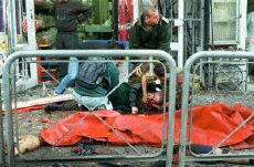 耶路撒冷發(fā)生自殺炸彈襲擊 至少兩人死亡(圖) 2002年03月21日 23:29 ![]() 一名傷者在死者遺體邊接受急救 中新網(wǎng)北京3月21日消息:耶路撒冷市中心今天發(fā)生自殺性炸彈襲擊,造成至少兩人死亡,另有四十人受傷。此事對美國推動中東和平進程的努力無疑又構(gòu)成沉重打擊。 當(dāng)?shù)鼐秸f,事件發(fā)生在當(dāng)?shù)貢r間21日下午4時25分左右。出事地點靠近最近發(fā)生的多起槍擊與炸彈襲擊地區(qū)。 目擊者說,多輛救傷車在事發(fā)后趕到現(xiàn)場并載走許多傷者,警方已封鎖現(xiàn)場,方便進行救人的工作。 據(jù)以色列電臺報道,初步報告指出,有7名傷者的傷勢相當(dāng)嚴(yán)重。