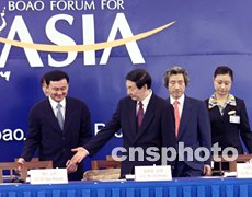 ![]() 博鰲亞洲論壇首屆年會十二上午在海南博鰲開幕,國務(wù)院總理朱镕基、日本首相小泉純一郎、泰國總理他信(左一)出席開幕式。中新社圖 滿會喬 攝