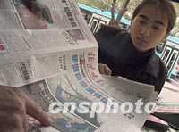 圖:北京市民關(guān)注國航客機(jī)墜機(jī)事件 2002年04月15日 16:50 ![]() 一位北京市民十五日下午正在街頭報亭購買當(dāng)日晚報,了解中國國際航空公司一架波音767客機(jī)在韓國釜山機(jī)場附近墜毀的相關(guān)消息。中新社記者 張勤 攝