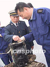 圖:救撈人員辨認飛機殘骸上的電子感應設備 2002年05月13日 13:56 ![]() 十二日中午,北海艦隊派出的救撈船又打撈出一塊較大飛機殘骸,殘骸中有一些關鍵設備。圖為北海艦隊副司令員張巖和海軍救撈船官兵正在辨認布滿電子元件的電子感應設備。中新社記者 王麗南 攝