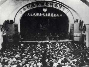 圖文:中國共產(chǎn)黨第七次全國代表大會(huì)簡(jiǎn)介 2002年05月14日 17:10 ![]() 圖為七大會(huì)場(chǎng) 1945年4月23日至6月11日,中國共產(chǎn)黨第七次全國代表大會(huì)在延安楊家?guī)X中央大禮堂召開,歷時(shí)50天。出席大會(huì)的正式代表547名,候補(bǔ)代表208名,共計(jì)755名,代表全國121萬黨員。大會(huì)選出毛澤東、朱德、劉少奇、周恩來、任弼時(shí)、林伯渠、彭德懷、康生、陳云、陳毅、賀龍、徐向前、高崗、張聞天、彭真15人組成主席團(tuán),選舉任弼時(shí)為大會(huì)秘書長(zhǎng)、李富春為副秘書長(zhǎng)。 大會(huì)的主要議程是:毛澤東作《論聯(lián)合政府》的政治報(bào)告;劉少奇作《關(guān)于修改黨的章程的報(bào)告》;朱德作《論解放區(qū)戰(zhàn)場(chǎng)》的軍事報(bào)告;周恩來作《論統(tǒng)一戰(zhàn)線》的報(bào)告;任弼時(shí)作關(guān)于黨的歷史問題的報(bào)告;通過新的黨章,選舉新的中央委員會(huì)。6月9日,選舉中央委員會(huì)委員4 4名。6月1 0日,選舉中央委員會(huì)候補(bǔ)委員3 3名。6月1 1日,大會(huì)閉幕,毛澤東致題為《愚公移山》的閉幕詞。