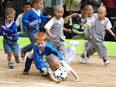 圖文:韓國小和尚比試腳法 “是否少林足球?” 2002年05月15日 10:18 ![]() 隨著世界杯的臨近,各地都在舉行豐富多彩的活動。14日漢城曹溪寺的童子和尚們與駐韓美國孩子們一起進行了一場別開生面的友誼賽。圖為,一童子尚由于過于快速帶球,一不小心跌倒在地。(據(jù)《中央日報》)
