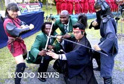 南非隊(duì)抵日:日本忍者護(hù)衛(wèi) 普通民眾歡迎(圖) 2002年05月29日 09:44 ![]() 從忍者處借刀留影的世界杯南非隊(duì)選手=24日下午,三重縣上野市(共同社) 中新網(wǎng)東京5月29日消息:將出戰(zhàn)世界杯的南非國(guó)家隊(duì)一行約40人24日抵達(dá)三重縣上野市的集訓(xùn)地,在這個(gè)“伊賀忍者的故鄉(xiāng)”,他們受到約2000市民的熱烈歡迎。 據(jù)“共同社”報(bào)道,選手們?cè)谏碇谏图t色忍者服的50名男女志愿者的護(hù)衛(wèi)之下,參加了為他們舉行的歡迎儀式。市長(zhǎng)今岡睦之鼓勵(lì)選手們“我期待你們能和日本隊(duì)在決賽中相遇”。 代表團(tuán)團(tuán)長(zhǎng)REUBEN·MAHLALELA在歡迎儀式上呼吁“我們最終選擇上野市作為集訓(xùn)地,希望各位在為日本隊(duì)加油助威的時(shí)候也別忘了為我們南非隊(duì)送上一點(diǎn)鼓勵(lì)。” 隨著種族歧視制度的消除,南非選手實(shí)力漸進(jìn),他們?cè)跉g迎儀式的舞臺(tái)上一邊用腳打著拍子一邊引吭高歌非洲民謠,熱鬧的氣氛遍布整個(gè)會(huì)場(chǎng)。 選手們絲毫看不出長(zhǎng)途旅行后的疲憊,對(duì)于簽名要求來(lái)者不拒,還有選手從忍者那里借來(lái)刀和市民們一起留影。扮演忍者的池澤基善(52)很開(kāi)心的說(shuō)道“在其他的集訓(xùn)地,有一些參賽隊(duì)選手不和市民交流,相比之下,南非的選手們可開(kāi)朗熱情多了!