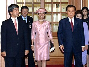 圖:日本天皇的弟弟拜訪韓國(guó)總統(tǒng)金大中 2002年05月30日 17:04 ![]() 5月30日在漢城,出席日韓世界杯開幕式的日本天皇的弟弟高元宮偕夫人拜訪韓國(guó)總統(tǒng)金大中。共同社圖