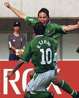 雙方各打半場好球 "雄獅"喀麥隆1-1平愛爾蘭(圖) 2002年06月01日 16:44 ![]() 愛爾蘭隊(duì)球員羅比-基恩與隊(duì)友為霍蘭德的進(jìn)球而歡呼。共同社圖 中新網(wǎng)東京6月1日消息:在剛剛在日本新瀉結(jié)束的世界杯外圍賽E組的首回合的第一場比賽中,“非洲雄獅”喀麥隆隊(duì)在領(lǐng)先一球的大好形勢下,被“綠衣男孩”愛爾蘭隊(duì)將比分追平,雙方以1-1結(jié)束了比賽。 由于隊(duì)長羅伊·基恩在世界杯前因?yàn)楹徒叹毑缓投顺,愛爾蘭隊(duì)的實(shí)力大打折扣。為此,愛爾蘭不得不以22人參加世界杯的比賽。而喀麥隆隊(duì)陣容完整,賽前顯得信心十足,表示要學(xué)習(xí)塞內(nèi)加爾好榜樣,全取3分。 上半場喀麥隆隊(duì)表現(xiàn)出色,他們利用嫻熟的個人技術(shù),不但向愛爾蘭隊(duì)的腹地發(fā)動沖擊。在鋒線上,在比賽中,姆博馬和埃托奧配合默契,給對手以很大的壓力。相對而言,愛爾蘭則遲遲沒有找到感覺,在比賽中顯得節(jié)奏有些跟不上,顯得很被動。比賽僵局在第39分鐘打破,埃托奧在右路利用出色的個人技術(shù)撕開對手的防線,并且將門將吸引出來,隨后他將球傳給門前的姆博馬,后者一蹴而就,率先破門得手。 此后,一球在手的喀麥隆隊(duì)開始有些放松,最終在上半場以1-0結(jié)束該場比賽。在下半場,愛爾蘭隊(duì)開始顯示出他們預(yù)選賽淘汰荷蘭隊(duì)的比賽中的素質(zhì),開始控制了比賽節(jié)奏。 下半場開始7分鐘后,愛爾蘭人的努力得到回報,由于喀麥隆隊(duì)后衛(wèi)解圍時出現(xiàn)低級失誤,將球送到中路愛爾蘭隊(duì)霍蘭德的腳下,后者迎球怒射,幸運(yùn)的將球送入對方大門。 此后,愛爾蘭圍著喀麥隆隊(duì)的大門狂轟濫炸,其中一次射門擊中門柱,但是只開花不結(jié)果,最終雙方以1-1握手言和。 愛爾蘭(442):吉文;凱利,哈特(77分鐘,雷德),斯湯頓,布林;麥卡蒂爾(46分鐘,菲南),霍蘭德,基爾巴尼,金塞拉;達(dá)夫、羅比-基恩 喀麥隆(3-5-2):門將:阿利烏姆;沃姆,宋,卡拉;查托,格雷米,勞倫,福,奧萊姆貝;埃托奧、姆博馬(69分鐘,蘇佛)