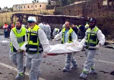 以色列汽車炸彈襲擊事件死亡人數(shù)上升至18人(圖) 2002年06月05日 15:47 ![]() 以色列汽車炸彈襲擊事件18人死亡,圖為工作人員清理現(xiàn)場(chǎng)。 中新網(wǎng)北京6月5日消息:以色列軍方電臺(tái)說,該國(guó)北部5日發(fā)生汽車炸彈爆炸事件,造成至少18人死亡,37人受傷,其中10人傷勢(shì)嚴(yán)重。 據(jù)法新社報(bào)道,這家電臺(tái)援引警方的消息說,16名以色列人在爆炸中喪生,其中包括多名士兵。 報(bào)道還補(bǔ)充說,另外還有兩具尸體身份尚未確定,可能是在車中的發(fā)動(dòng)襲擊者。 在以色列北部港口城市海法,這輛放置有炸彈的汽車在一輛以色列公共汽車后面爆炸,引起公車燃起大火。
