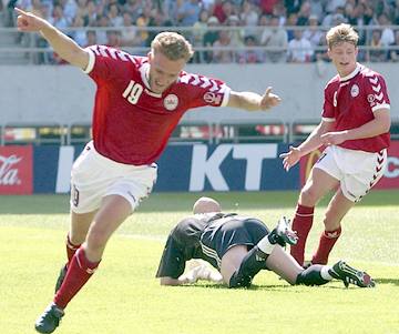 圖:19號(hào)羅梅達(dá)爾為丹麥隊(duì)攻入一球 2002年06月11日 15:59 ![]() 世界杯A組丹麥隊(duì)與法國隊(duì)場上比分為丹麥隊(duì)1-0領(lǐng)先。丹麥19號(hào)羅梅達(dá)爾為丹麥隊(duì)先拔頭籌。圖為羅梅達(dá)爾在慶賀進(jìn)球。共同社圖