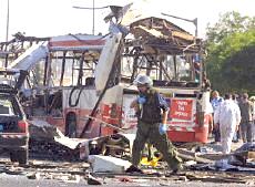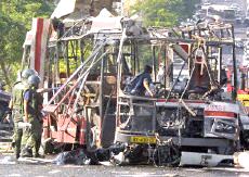 耶路撒冷市中心公共汽車爆炸案已有18人死亡(圖) 2002年06月18日 15:29 ![]() ![]() 被襲擊的公共汽車 中新網(wǎng)北京6月18日消息:以色列電視二臺18日報道說,耶路撒冷市中心當日上午發(fā)生公共汽車自殺炸彈襲擊事件,造成17人死亡。 報道沒有說明死亡人數(shù)中是否包括自殺炸彈襲擊者本人。這起自殺性炸彈襲擊還造成車上32人受傷。 這輛公共汽車從耶路撒冷南郊的吉羅猶太人區(qū)開往市中心,當時正是交通高峰時段。 阿克薩烈士旅宣稱對耶路撒冷公汽爆炸案負責 中新網(wǎng)北京6月18日消息:黎巴嫩真主黨游擊隊的電視臺18日接到匿名電話,此人聲稱“阿克薩烈士旅”對耶路撒冷爆炸案負責。 德新社援引該電視臺的報道說,這次炸彈襲擊是為了“阿克薩烈士旅”在伯利恒的領(lǐng)導人蘇布赫17日被殺而進行的報復。 耶路撒冷南部18日交通高峰時段發(fā)生公共汽車爆炸案,造成13人死亡,40人受傷,其中5人情況危急。 哈馬斯組織也聲稱對耶路撒冷公汽爆炸案負責 中新網(wǎng)北京6月18日消息:巴勒斯坦激進的“伊斯蘭抵抗運動”(哈馬斯組織)18日宣稱對耶路撒冷公共汽車爆炸案負責。 有人給法新社打去匿名電話,聲稱哈馬斯組織的軍事派別“卡薩姆旅”實施了這次行動。 另據(jù)報道,黎巴嫩真主黨游擊隊的電視臺也接到匿名電話,此人聲稱“阿克薩烈士旅”對耶路撒冷爆炸案負責。 耶路撒冷市中心18日交通高峰時段發(fā)生公共汽車爆炸案,造成17人死亡,約30人受傷。 沙龍親臨耶路撒冷爆炸現(xiàn)場拒談巴勒斯坦建國 中新網(wǎng)北京6月18日消息:在耶路撒冷市中心發(fā)生造成17人死亡的公汽爆炸案后,以色列總理沙龍18日拒絕巴勒斯坦建國。 據(jù)法新社報道,沙龍在事發(fā)現(xiàn)場對記者表示:“你還能談什么巴勒斯坦國家。”這是沙龍出任總理以來首次親往巴勒斯坦人自殺炸彈襲擊現(xiàn)場視察。 沙龍在數(shù)十名警察和保鏢的簇擁下表示:“我們今天見到的是巴勒斯坦恐怖主義,我們必須打擊這種恐怖主義,這也正是我們在做的。” 美國官員最近提出建立臨時的巴勒斯坦國家的構(gòu)想,并通過談判確定其最終的形式。 18日的自殺性炸彈襲擊發(fā)生之際,美國總統(tǒng)布什正準備宣布其中東和平新戰(zhàn)略。 耶路撒冷公汽爆炸案造成18名以色列人死亡 中新網(wǎng)北京6月18日消息:18日在耶路撒冷市中心,一名巴勒斯坦人在公共汽車上引爆炸彈,造成18名以色列人死亡,其中包括一些學童。 據(jù)法新社報道,醫(yī)院官員透露說,48名傷者正在接受治療,其中包括數(shù)名年齡在10到12歲之間的兒童。 報道還說,一名婦女在入院后不久就不治身亡,另外還有6名傷者的傷勢嚴重。 相關(guān)報道:耶路撒冷南部發(fā)生公車爆炸 13人死亡40人受傷