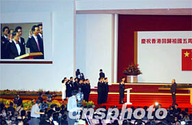 中新社香港七月一日電(記者張傳熙黃少華)慶祝香港回歸五周年大會(huì)暨第二屆香港特區(qū)政府就職典禮今天上午在香港會(huì)展中心新翼大會(huì)堂舉行。香港特別行政區(qū)第二任行政長(zhǎng)官董建華和第二屆特區(qū)政府十九名主要官員在莊嚴(yán)的儀式上宣誓就職。 世界的目光今早再度投向美麗的香港。座落在維多利亞港畔的香港會(huì)展中心新翼大會(huì)堂今早燈光璀璨,嘉賓如潮。紅色成了就職典禮的主色調(diào):呈梯形狀的主席臺(tái)上鋪著紅色地毯,政府官員沿著紅色臺(tái)階,魚貫登臺(tái)宣誓。 這標(biāo)志著香港特區(qū)首屆政府已順利完成歷史使命,繼任的新一屆政府已全部到位并開始運(yùn)作。 出席儀式的國(guó)家主席江澤民代表中央政府和全國(guó)各族人們,向新就任的特區(qū)第二任行政長(zhǎng)官董建華和第二屆政府主要官員、行政會(huì)議成員表示祝賀。江澤民還在會(huì)上發(fā)表講話,希望特區(qū)政府與各界人士與時(shí)并進(jìn),積極進(jìn)取,努力創(chuàng)造香港更加美好的未來(lái)。 上午,鮮花、綠樹裝點(diǎn)的香港會(huì)展中心新翼五樓大禮堂一片喜慶。會(huì)場(chǎng)正中的主席臺(tái)上方,懸掛著國(guó)旗和香港特區(qū)區(qū)旗。江澤民主席在行政長(zhǎng)官董建華的陪同下步入大會(huì)堂時(shí),全場(chǎng)二千名嘉賓起立鼓掌,向江澤民的到來(lái)表示熱烈歡迎。 八時(shí)五十九分,就職典禮在雄壯的國(guó)歌聲中拉開帷幕。最先走上主席臺(tái)宣誓就職的是行政長(zhǎng)官董建華。國(guó)家主席江澤民監(jiān)誓。董建華莊嚴(yán)地舉起右手,宣誓:“本人就任中華人民共和國(guó)香港特別行政區(qū)行政長(zhǎng)官,定當(dāng)擁護(hù)中華人民共和國(guó)香港特別行政區(qū)基本法,效忠中華人民共和國(guó)香港特別行政區(qū),盡忠職守,遵守法律,廉潔奉公,為香港特別行政區(qū)服務(wù),對(duì)中華人民共和國(guó)中央人民政府和香港特別行政區(qū)負(fù)責(zé)”。 宣誓畢,江澤民主席和董建華緊緊握手,全場(chǎng)掌聲如潮。 五年前的今天,董建華第一次宣誓就任首屆特區(qū)行政長(zhǎng)官。從那時(shí)起,香港的歷史改寫了,香港回到了祖國(guó)的懷抱,開始了港人治港的新里程。今天董建華再次宣誓就職,不同的是,他標(biāo)志著新一屆特區(qū)政府將承前啟后管治香港,對(duì)香港的未來(lái)將會(huì)有更多的承擔(dān)。 接著,江澤民監(jiān)誓下宣誓就職的還有由董建華提名、中央政府任命的第二屆特區(qū)政府十九名主要官員,包括三司十一局以及警務(wù)處、入境處、海關(guān)、廉政公署以及審計(jì)處官員。而改組后的行政會(huì)議十九名成員也在董建華的監(jiān)誓下,由政務(wù)司司長(zhǎng)曾蔭權(quán)帶領(lǐng)宣誓就職。 第二屆行政長(zhǎng)官董建華在宣誓禮畢后發(fā)表講話。他說(shuō),在我即將履行第二任行政長(zhǎng)官職責(zé)的時(shí)候,我意識(shí)到所面對(duì)的形勢(shì)是嚴(yán)峻的,擔(dān)任的責(zé)任是重大的。他說(shuō),帶領(lǐng)香港經(jīng)濟(jì)走出困境,恢復(fù)市民對(duì)前景的信心,是本屆政府面對(duì)的挑戰(zhàn)。 他表示,政府將竭盡所能,充分利用內(nèi)地經(jīng)濟(jì)發(fā)展的機(jī)會(huì),開拓香港的發(fā)展空間,香港將會(huì)加快和廣東省的全面合作。他表示相信,過(guò)去五年的調(diào)整和適應(yīng),雖然歷盡艱辛,但卻又為香港將來(lái)的興旺奠定了基礎(chǔ)。他相信香港在各界的精誠(chéng)團(tuán)結(jié)努力下,一定能夠走出困境。 江澤民主席在會(huì)上發(fā)表講話,充分肯定了香港過(guò)去五年所取得的成就。江澤民指出,香港回歸祖國(guó)以來(lái)的五年,是“一國(guó)兩制”由科學(xué)構(gòu)想變?yōu)樯鷦?dòng)現(xiàn)實(shí)的五年,也是董建華先生領(lǐng)導(dǎo)的特區(qū)政府團(tuán)結(jié)各界人士不斷克服困難、奮力前進(jìn)的五年。他說(shuō)今天的香港,“一國(guó)兩制”、“港人治港”、高度自治方針得到全面落實(shí),原有的資本主義制度保持不變,廣大居民繼續(xù)以自己習(xí)慣的方式生活。香港仍然保持著自由港的特色和國(guó)際貿(mào)易、金融、航運(yùn)中心的地位,繼續(xù)被公認(rèn)為亞洲乃至全球最具活力的地區(qū)之一。 江澤民說(shuō),事實(shí)充分證明,“一國(guó)兩制”是完全行得通的,董建華先生及其領(lǐng)導(dǎo)的特區(qū)政府是具有駕馭復(fù)雜局勢(shì)的能力的,香港人是完全能夠治理好香港的。他說(shuō),五年來(lái)我們所獲得的經(jīng)驗(yàn)和體會(huì),歸結(jié)起來(lái),就是在任何情況下都必須全面正確地貫徹“一國(guó)兩制”的方針和香港基本法,全力支持行政長(zhǎng)官和特區(qū)政府依法施政。 江澤民說(shuō),現(xiàn)在世界多極化和經(jīng)濟(jì)全球化趨勢(shì)深入發(fā)展,科技進(jìn)步日新月異,綜合國(guó)力競(jìng)爭(zhēng)日趨激烈,國(guó)際局勢(shì)正在發(fā)生深刻的變化。他說(shuō),中國(guó)正在實(shí)施現(xiàn)代化建設(shè)的第三步戰(zhàn)略目標(biāo),今后五到十年,也是香港經(jīng)濟(jì)和社會(huì)發(fā)展的關(guān)鍵時(shí)期。 江澤民在講話中,還提出三點(diǎn)希望:希望香港各界更好地適應(yīng)香港回歸后的發(fā)展形勢(sh
