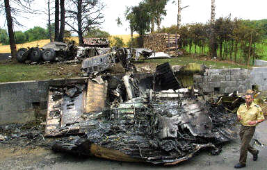 圖文:一警官從墜毀的圖-154殘骸前經過 2002年07月03日 14:30 德國當地時間7月1日夜(北京時間2日晨),一架DHL公司的波音757貨機和俄羅斯巴什基爾航空公司的圖-154客機在德國巴登-符騰堡州于伯林根鎮(zhèn)上空相撞并墜毀,造成71人死亡,其中包括52名兒童。圖為一名警官從墜毀的圖-154殘骸前經過。(春風)