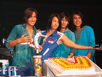 吳建豪過生日 F4和歌迷一起開心!按蟆眽(圖) 2002年08月08日 09:42 ![]() F4成員為吳建豪(左二)賀生辰 中新網(wǎng)香港8月8日消息:F4前日旋風(fēng)襲港出席百事的首播會(huì),其后只有吳建豪多留港一天,除了跟歌迷共慶生日外,還為新歌《聽身體唱歌》招募MV女主角,另三位成員已先行返臺(tái)灣。 據(jù)此間文匯報(bào)報(bào)道說,前晚的首播會(huì)上,吳建豪和言承旭突然走下臺(tái)與歌迷握手,引起現(xiàn)場一度混亂,受到歌迷的熱情感染,言承旭和朱孝天來了兩下“胸頂胸”,教歌迷看得怦然心動(dòng)。吳建豪和仔仔周渝民差點(diǎn)被歌迷的熱情感動(dòng)得掉下淚來,一些歌迷更送上生日禮物給壽星仔吳建豪。 活動(dòng)完畢后,他們便拉隊(duì)到郭富城的餐聽為建豪慶祝生日,城城雖沒有出現(xiàn),也送來蛋糕和鮮花。 壽星仔吳建豪昨午繼續(xù)同二百位歌迷慶祝,期間他以廣東話向在場歌迷說:“我愛你,多謝。”他又很留心看八位候選的女主角,他對各人的表現(xiàn)都很滿意。有位參賽者更表演一字馬,惜未能為她取得更高分。 吳建豪切生日蛋糕時(shí),突然興奮得拿著切蛋糕的刀轉(zhuǎn)圈,似是在耍雜技,切過蛋糕后,他迅速舔一舔刀上的蛋糕。其后,他表示因在小時(shí)候沒有太多朋友,便經(jīng)常拿刀當(dāng)玩具般玩。 問到剛挑選出來的MV女主角,到時(shí)建豪和她可有親熱鏡頭,建豪磨拳擦掌說:“不知道,要看導(dǎo)演的安排,相信歌迷知道我是工作,不會(huì)生氣!
