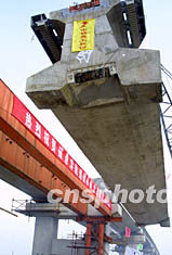 五日,隨著第2550根預應力混凝土軌道梁穩(wěn)穩(wěn)地架設在磁懸浮工程的蓋梁上,上海磁懸浮工程實現(xiàn)了軌道梁全線貫通。圖為第2550根軌道梁架設成功。作者:湯彥俊