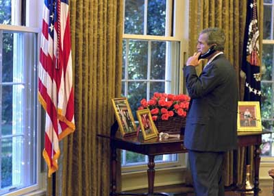 中新網(wǎng)北京9月6日消息:據(jù)法新社發(fā)自白宮的消息,美國總統(tǒng)喬治-布什今天打電話給中國、俄羅斯和法國的領(lǐng)導人,就伊拉克問題進行了商談。