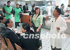 國際知名廚師、美國電視烹飪節(jié)目“甄能煮”主持人甄文達(dá)(右),九月十二日在“香港中華廚藝學(xué)院”,向三十多個(gè)美國游客介紹中華廚藝。中新社圖 張淑琴 攝