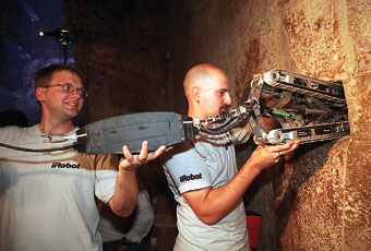 由于金字塔密室信道的容積很小,一般人無法進(jìn)去,所以考古學(xué)家們只有動(dòng)用微型機(jī)械人。負(fù)起這次探索重任的是“金字塔漫游者”,它是根據(jù)去年“九·一一”事件后協(xié)助搜尋生還者的機(jī)械車設(shè)計(jì)的。