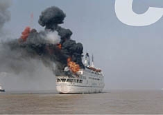 九時(shí)三十四分,“恐怖分子”驚慌從“東海一號”輪沿繩索滑下,乘快艇逃逸,兩分鐘后遇難船上便傳來兩聲巨響、火光沖天,“恐怖分子”用遙控器引爆了“東海一號”輪,剎那間,海面上濃煙滾滾--而此時(shí),水上交通管制系統(tǒng)的雷達(dá)已經(jīng)鎖定了“恐怖分子”逃逸的快艇。九時(shí)四十一分,三艘海警船在控制中心的引導(dǎo)下迅速追擊攔截、擒獲所有“恐怖分子”。