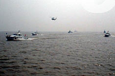上午九時(shí)整,隨著三顆紅色信號在該水域騰空而起,一場中國規(guī)模最大的海上搜救演習(xí)--二○○二年海上搜救、反恐怖、溢油應(yīng)急綜合演習(xí)由此拉開帷幕。