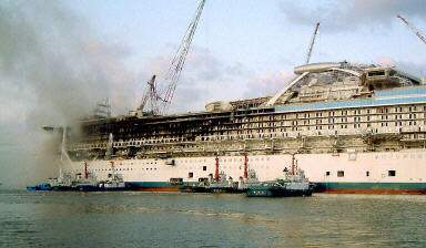 火災(zāi)發(fā)生在昨日下午六時(shí)左右。正在進(jìn)行內(nèi)裝修的“鉆石公主”號五層甲板首先起火,由于船內(nèi)尚未配置消防設(shè)備,未受控制的火勢迅速向上蔓延,濃煙翻滾。正在船內(nèi)施工的近千名工人聽到警報(bào)后迅速撤出,無人受傷。