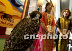 一只卡塔爾蒙面金雕在十月的釜山亞運(yùn)會(huì)新聞中心里,為下屆亞運(yùn)會(huì)在多哈舉行身為吉祥物公關(guān)。作者:賈國榮