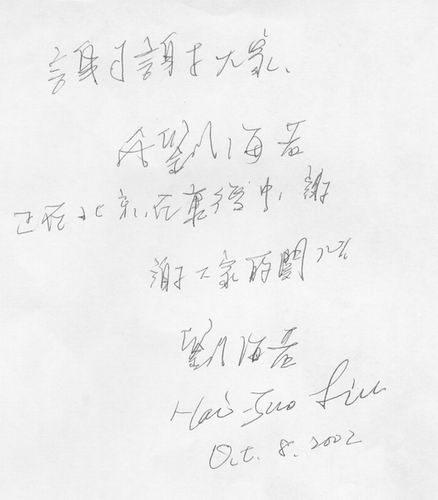 進(jìn)入10月以來,海若已能夠用文字表達(dá)自己的感情。在一張紙上,海若寫道:“謝謝大家。我是劉海若,正在北京康復(fù)中。謝謝大家的關(guān)心!辈⒂弥杏⑽膶懴伦约旱拿。在另一張紙上,海若寫道:“很想念大家,希望大家幸福快樂。我很快回到工作崗位和大家見面。聽說小莉要生寶寶了,祝她們健康幸福!