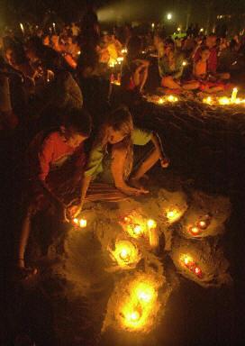10月14日,在巴厘島的外國兒童點(diǎn)燃蠟燭為爆炸中的受害者祈禱。
