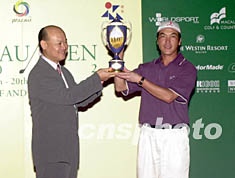“2002澳門高爾夫球公開賽”二十日結束比賽,中國選手張連偉成功衛(wèi)冕,獲得該賽事冠軍。圖為澳門體育發(fā)展局局長肖威利向張連偉頒發(fā)獎杯李剛 攝