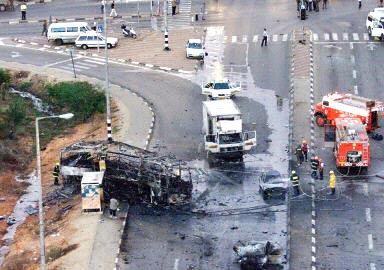 以色列電視和電臺(tái)報(bào)導(dǎo)說,一輛吉普類型的汽車在以色列巴德卡納鎮(zhèn)駛向一輛公車旁并引爆,汽車上載有炸藥和數(shù)罐汽油,還坐有兩人。